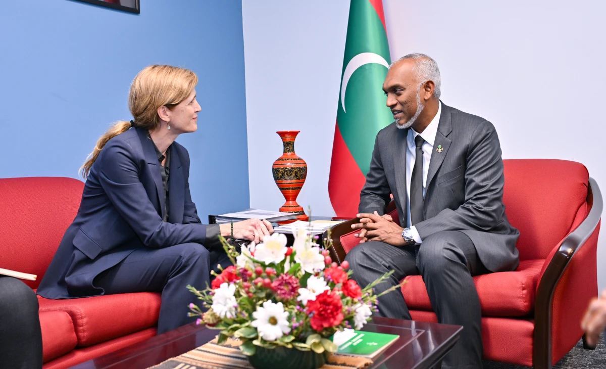 އދގެ އާންމު މަޖިލީހުގެ 79 ވަނަ ސެޝަންގެ ހަވާސާގައި ރައީސުލްޖުމްހޫރިއްޔާ ޑޮކްޓަރ މުޙައްމަދު މުޢިއްޒު، ޔޫ.އެސް އޭޖެންސީ ފޮރ އިންޓަރނޭޝަނަލް ޑިވެލޮޕްމެންޓް (ޔޫ.އެސް.އެއިޑް) ގެ އެޑްމިނިސްޓްރޭޓަރ ސަމަންތާ ޕަވަރއާ ބައްދަލުކުރައްވައިފިއެވެ.